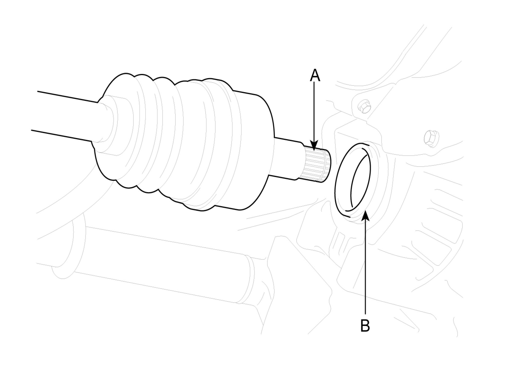 1. Apply gear oil on the drive shaft splines (A) and the contacting surface of differential case oil seal (B).