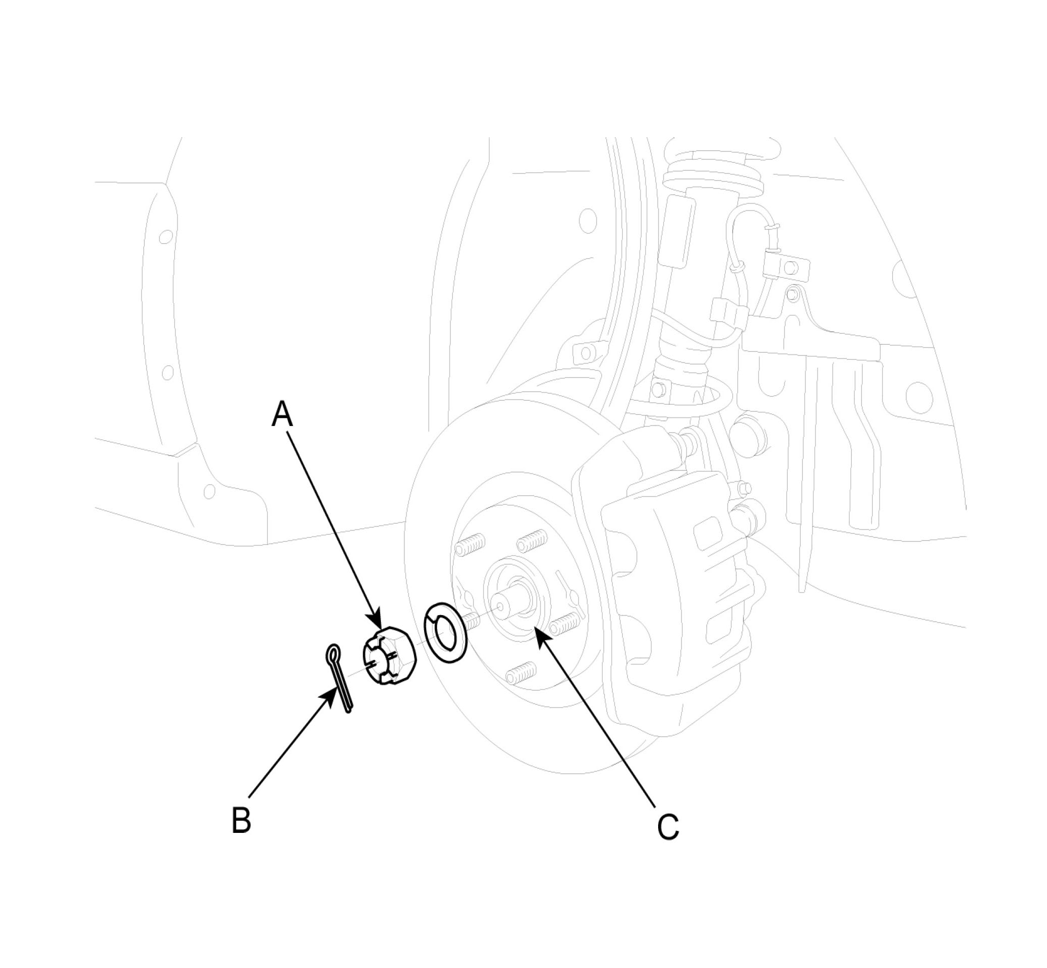 2. Remove the spilt pin (B) and driveshaft castle nut (A) and washer from the front hub (C).