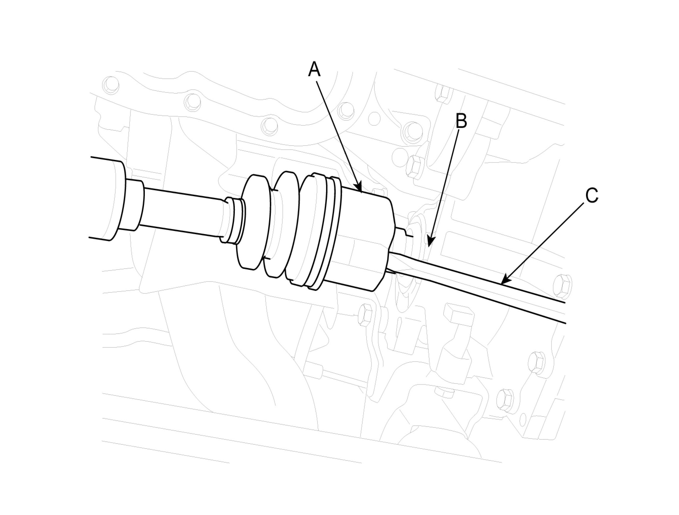 8. Removing the driveshaft (A) from the transaxle by using a pry bar (C) as shown below.