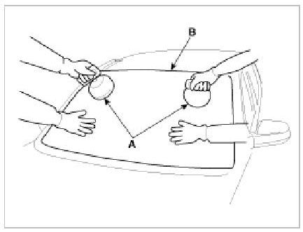 9. Use suction cups (A) to hold the windshield over the opening, align it with the alignment marks (B) made in step 15, and set it down on the adhesive. Lightly push on the windshield until its edges are fully seated on the adhesive all the way around. Do not open or close the doors until the adhesive is dry.