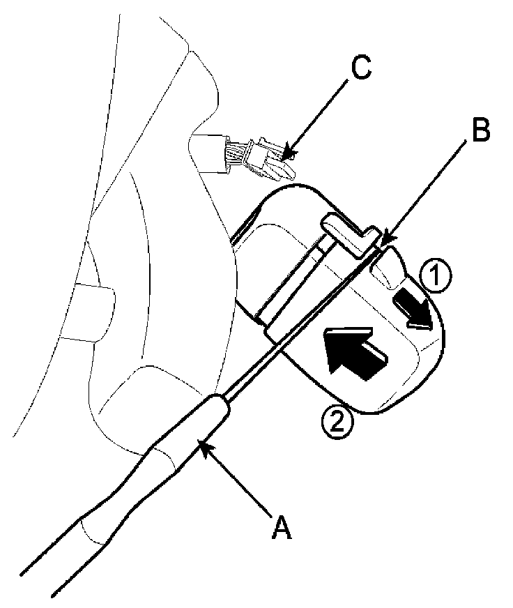 1. Remove the rain sensor cover first. Be careful not to damage the cover latch by applying excessive force. To remove the latch, pull aside the latch using the cover hole (B) with a small slotted (-) screwdriver (A).