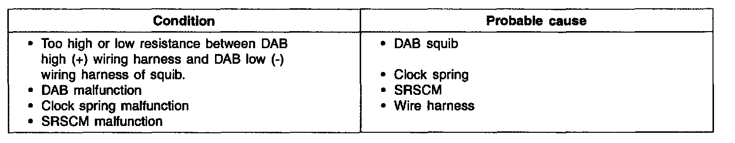 The DAB squib circuit consists of the SRSCM, the clock spring and the DAB. The circuit causes the airbag to deploy when the airbag deployment conditions are satisfied. The above DTCs are recorded when the DAB circuit is open or the DAB resistance too high or low is detected in the DAB squib circuit.