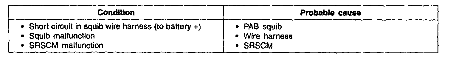 It causes the SRS to deploy when the SRS deployment conditions are satisfied. The above DTC is recorded when a short to battery is detected in the squib circuit.