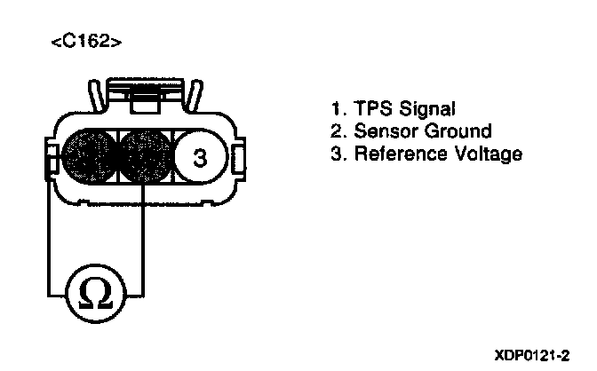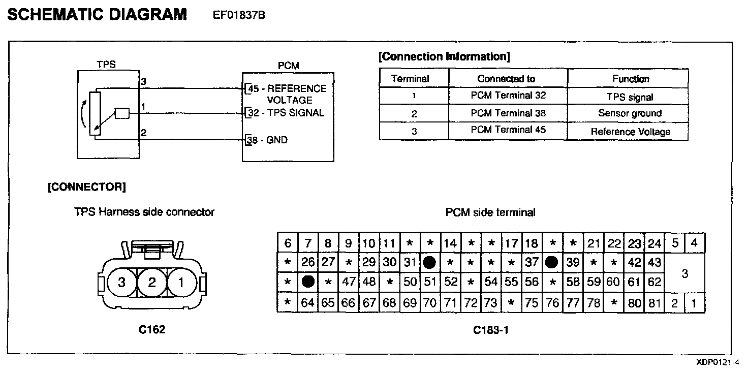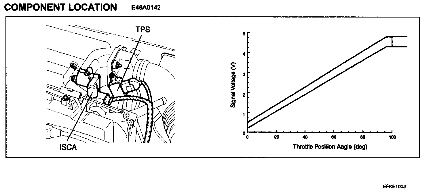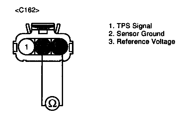 The Throttle Position Sensor (TPS) is mounted on the throttle body and detects the opening angle of the throttle plate. The TPS has a variable resistor (potentiometer) whose characteristic is the resistance changing according to the throttle angle. During acceleration, the TPS resistance between the reference 5 V and the signal terminal decreases and output voltage increases; during deceleration, the TPS resistance increases and TPS output voltage decreases. The PCM supplies a reference 5 V to the TPS and the output voltage increases directly with the opening of the throttle valve. The TPS output voltage will vary from 0.2 - 0.8 V at closed throttle to 4.3 - 4.8 V at wide-open throttle.The PCM determines operating conditions such as idle (closed throttle), part load, acceleration/deceleration, and wide-open throttle from the TPS. Also The PCM uses the Mass Air Flow Sensor (MAFS) signal along with the TPS signal to adjust fuel injection duration and ignition timing.