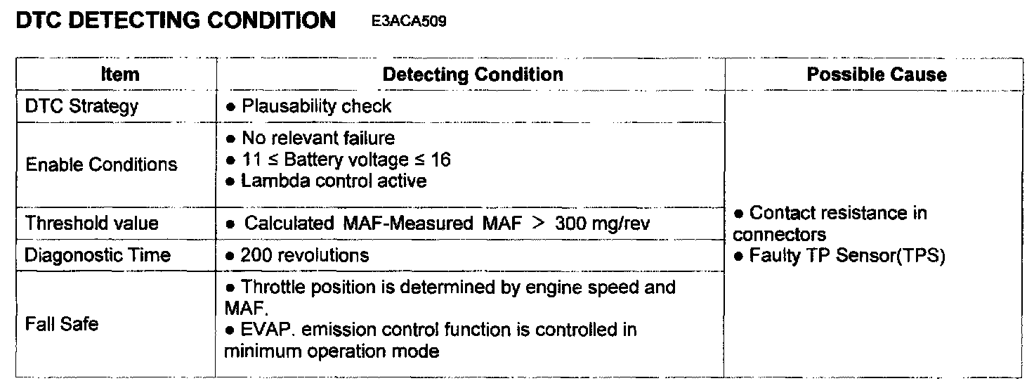 The PCM compares the actual measured Mass Air Flow signal with the modeled Mass Air Flow value to detect implausible TPS signal. Because throttle position is one of key parameters in determining the modeled MAF. The modeled Mass Air Flow value is determined by engine speed, throttle angle and ISCA duty. The DTC P0121. is set when the difference between these two value is too high or too low with lambda deviation in same direction for a certain time.