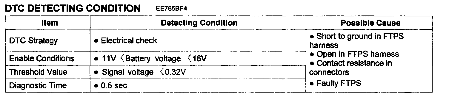 PCM sets DTC P0452. if the PCM detects signal voltage lower than the possible range of a properly operating FTPS.