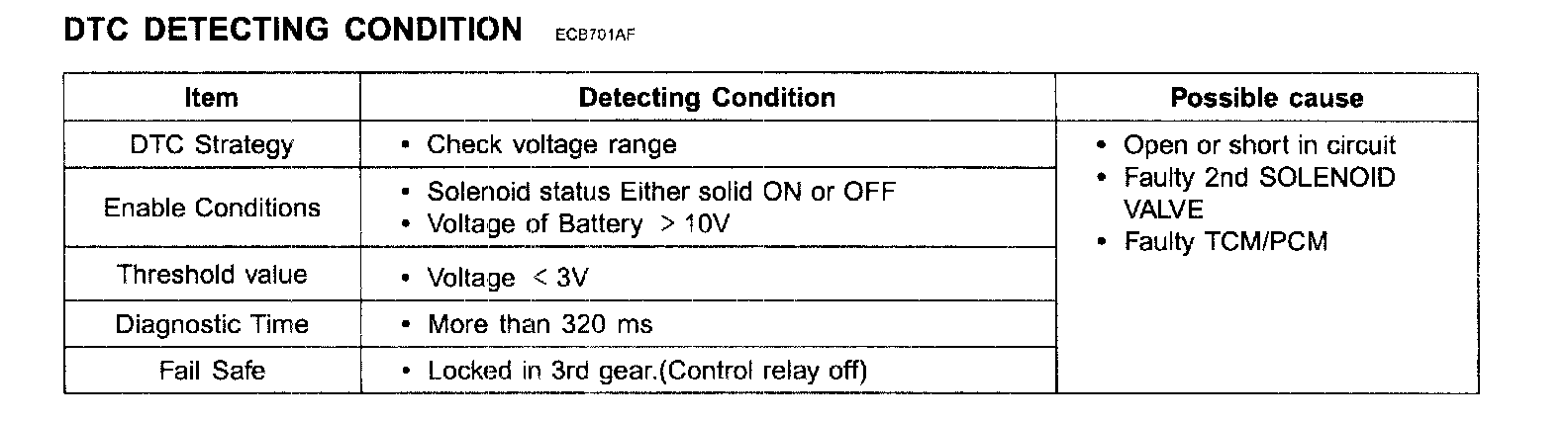 The PCM/TCM checks the Under Drive Clutch Control Signal by monitoring the feedback signal from the solenoid valve drive circuit. If an unexpected signal is monitored, (For example, high voltage is detected when low voltage is expected or low voltage is detected when high voltage is expected) the TCM judges that 2nd Brake drive control solenoid circuit is malfunctioning and sets this code.