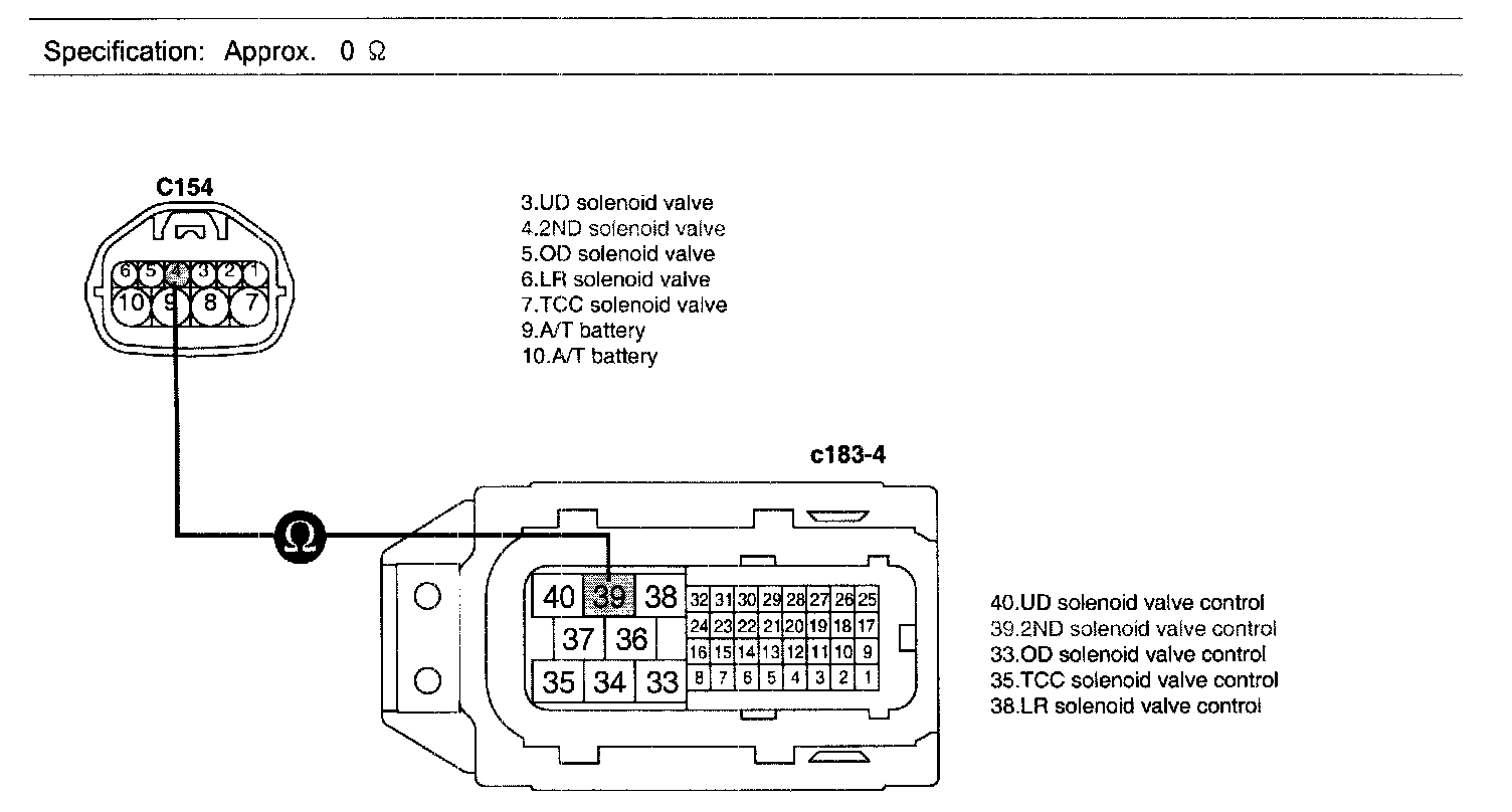 3. Measure resistance between terminal "4" of the ATM SOLENOID VALVE harness connector and terminal "39" of the PCM/TCM harness connector.