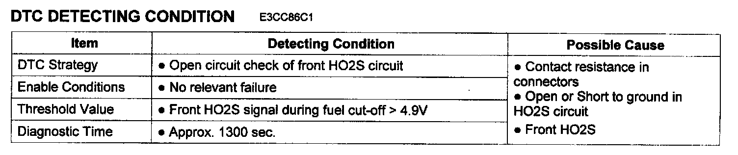 The PCM monitors front O2 sensor signal level during fuel cut-off operation. This signal monitoring will determine open circuit of Reference Ground Circuit (PCM pin No.53). The PCM sets DTC P2251. if front O2 signal during fuel cut-off is higher than predetermined threshold. If the same error code is set in the next driving cycle the PCM illuminates the MIL