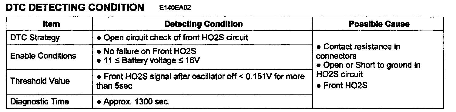 The PCM monitors front HO2S tip temperature and signal at the same time to check open circuit of Pumping Current Trim Circuit (PCM PIN No.41). The PCM sets DTC P2626 if front O2 tip temperature is lower than the predetermined threshold and if front HO2S signal after oscillator off is lower than the predetermined threshold.