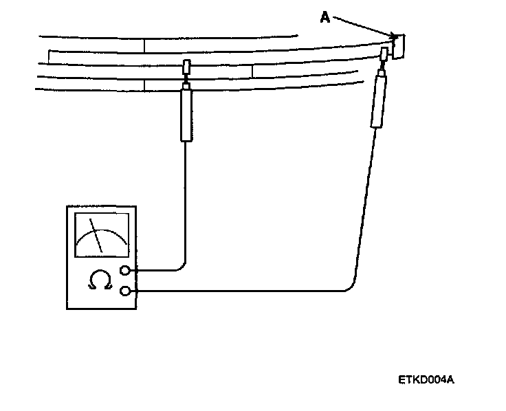 2. Touch one tester probe to the glass antenna terminal (A), and move the other tester probe along the antenna wires to check that continuity exists.