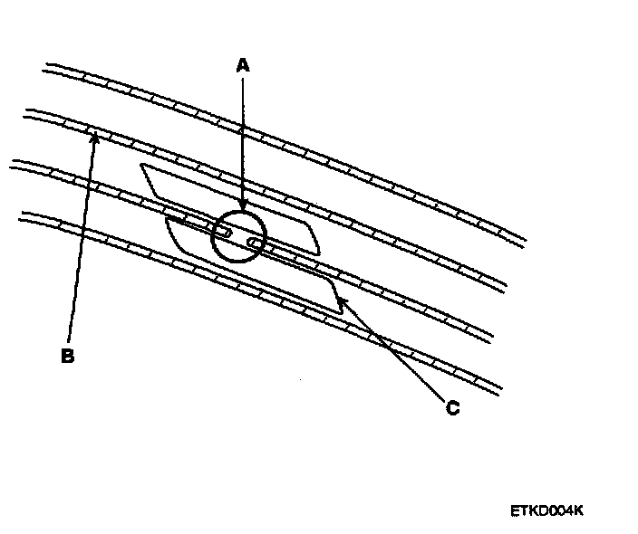 2. Carefully mask above and below the broken portion of the glass antenna wire (B) with cellophane tape (C).