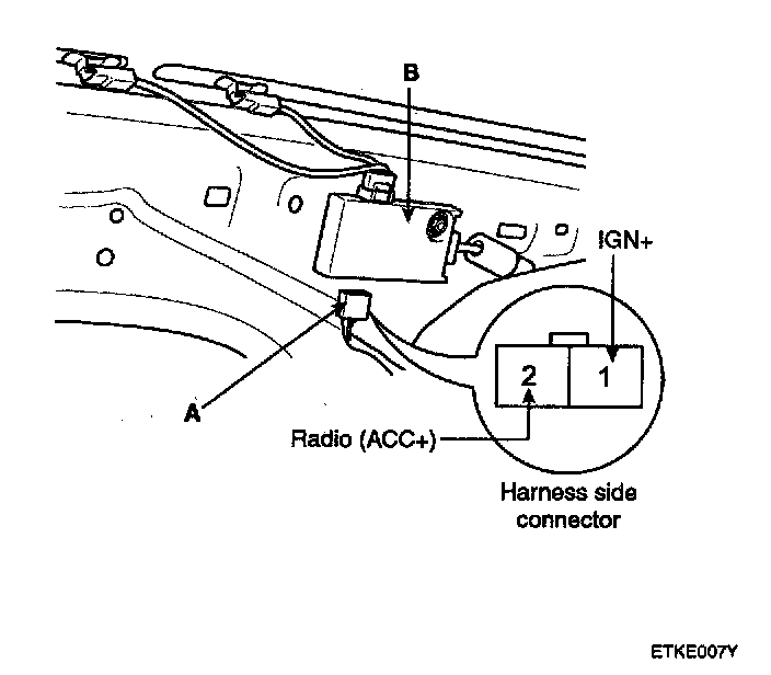 1. Remove the right side rear pillar trim, then disconnect the 2P power connector (A) from the glass antenna amp(B).