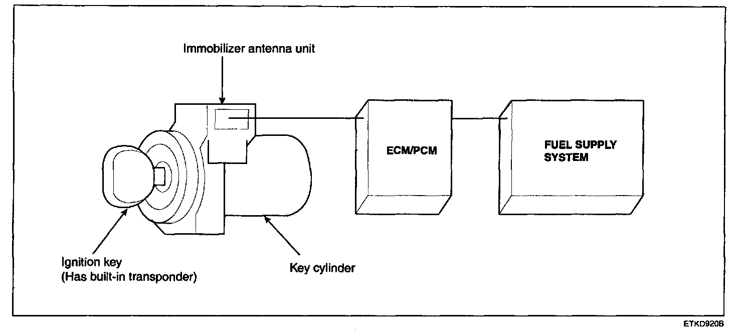 The vehicle immobilizer system consists of the ECM/PCM, the Immobilizer antenna unit (SMARTRA) and transponder built into the ignition key.