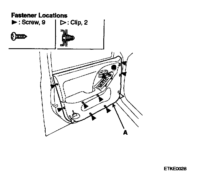 1. Remove the front door trim panel (A) after removing 9 screws.