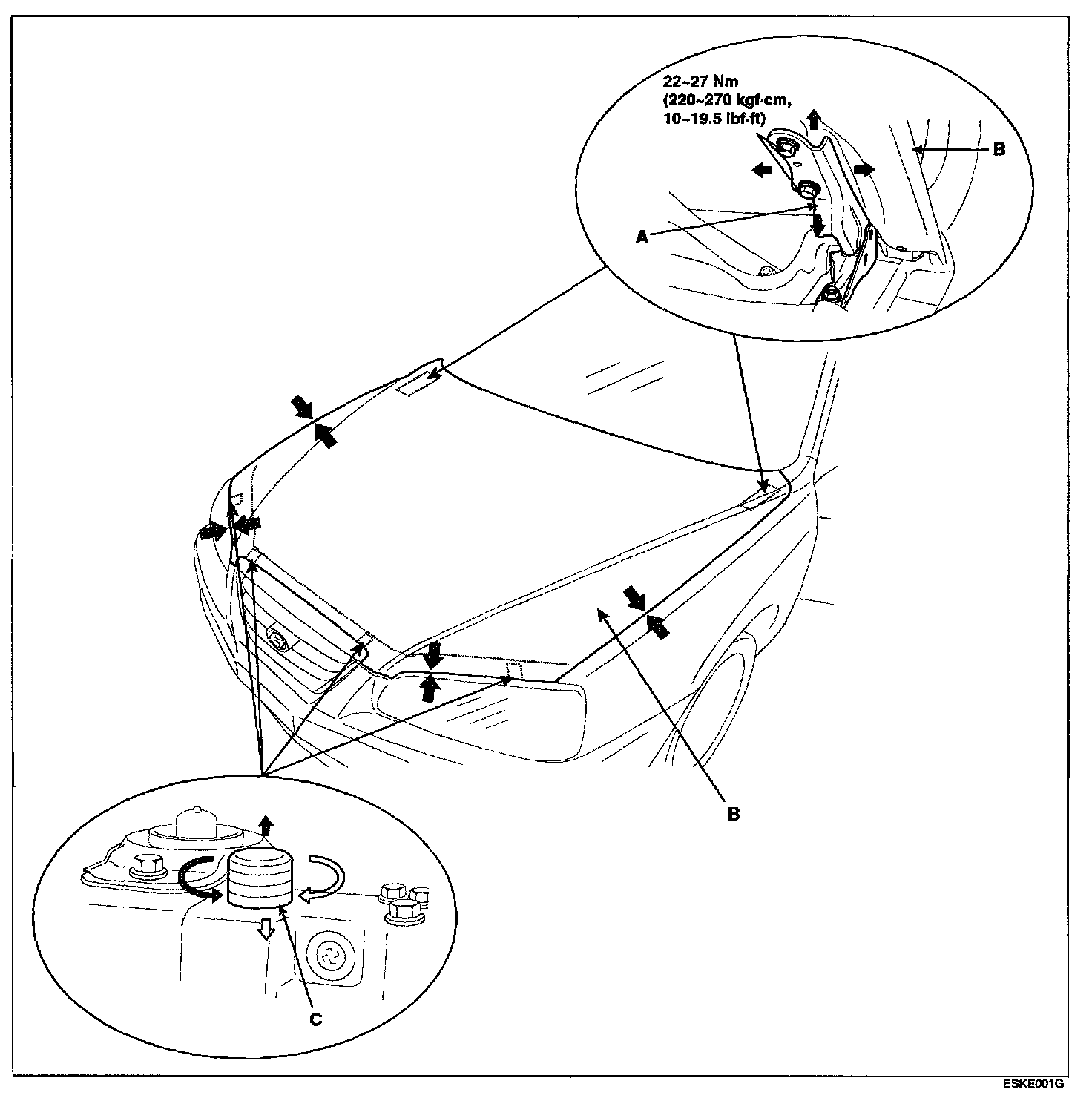 After loosening the hood hinge mounting bolt (A), adjust the