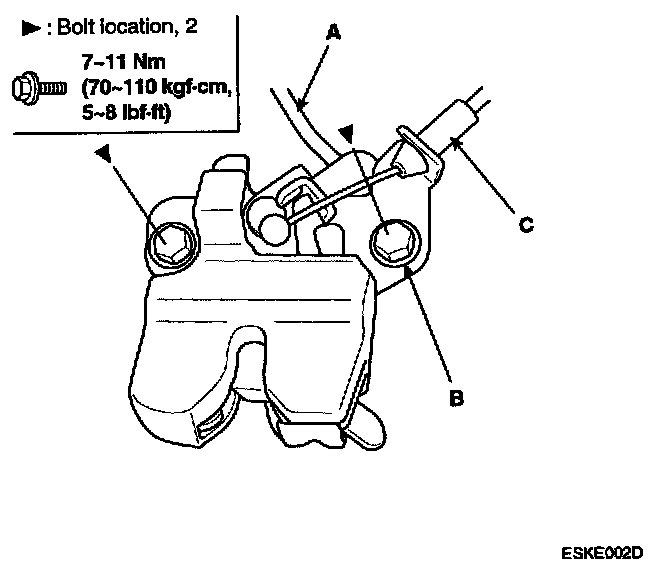 2. Loosen the latch mounting bolts (B) and disconnect the inside handle cable (C).