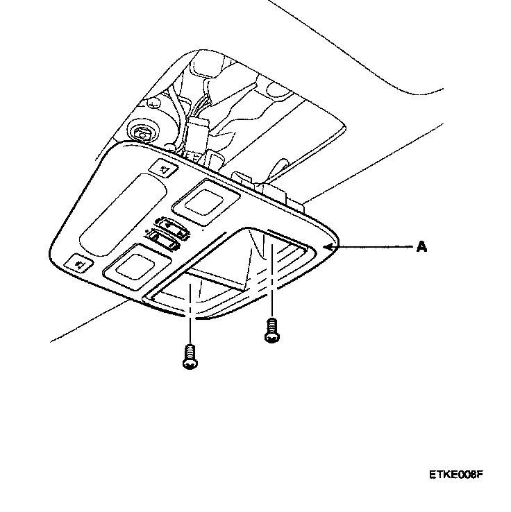 2. Open the sunglass case from the overhead console then remove the 2 screws holding the overhead console (A).