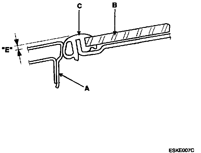 4. The roof panel (A) should be even with the glass (B) weatherstrip (C), to within the standard value "E" all the way around. If not, make the following adjustment.