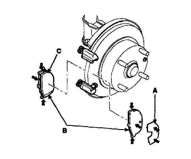 12. Install the brake pads (B) and pad shim (A) on the caliper bracket. Install the inner pad with its wear indicator (C) facing down ward.