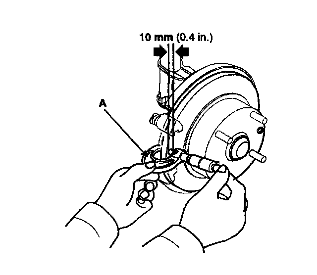 3. Using a micrometer (A), measure disc thickness at eight points, approximately 45° apart and 10 mm (0.4 inch) in from the outer edge of the disc. Replace the brake disc if the smallest measurement is less than the max. refinishing limit.