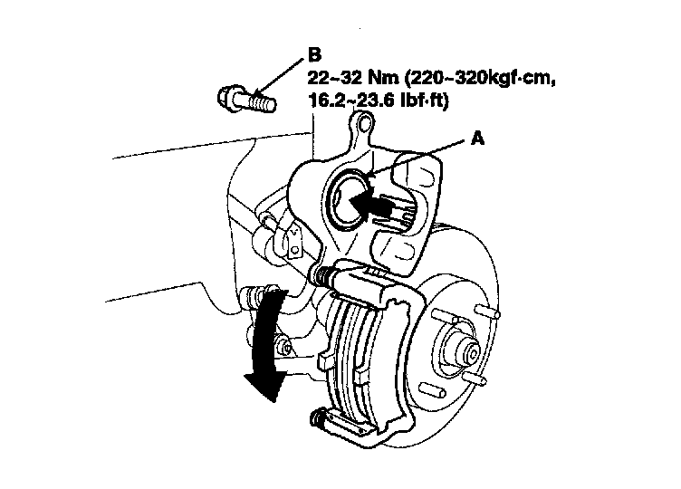 13. Pivot the caliper down into position. Being careful not to damage the pin boot, install the guide rod bolt (B) and torque it to proper specification.