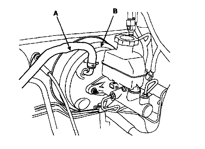 1. Disconnect the brake booster vacuum hose (check valve built in) (A) at the booster (B).
