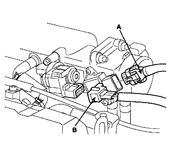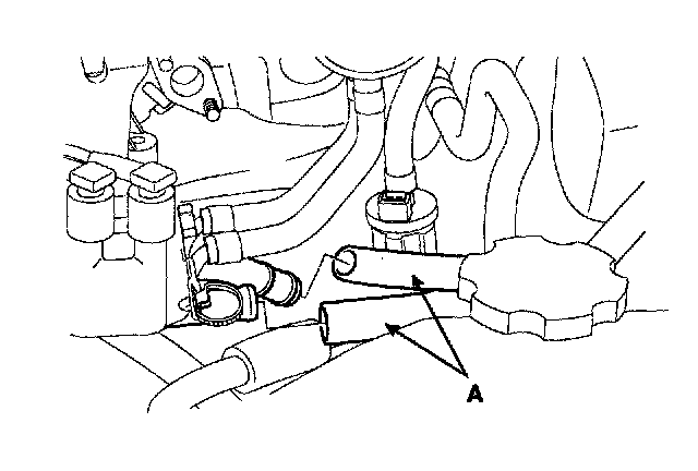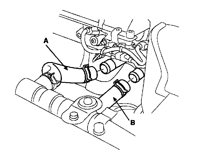 24. Install the upper radiator hose (A) and lower radiator hose (B).