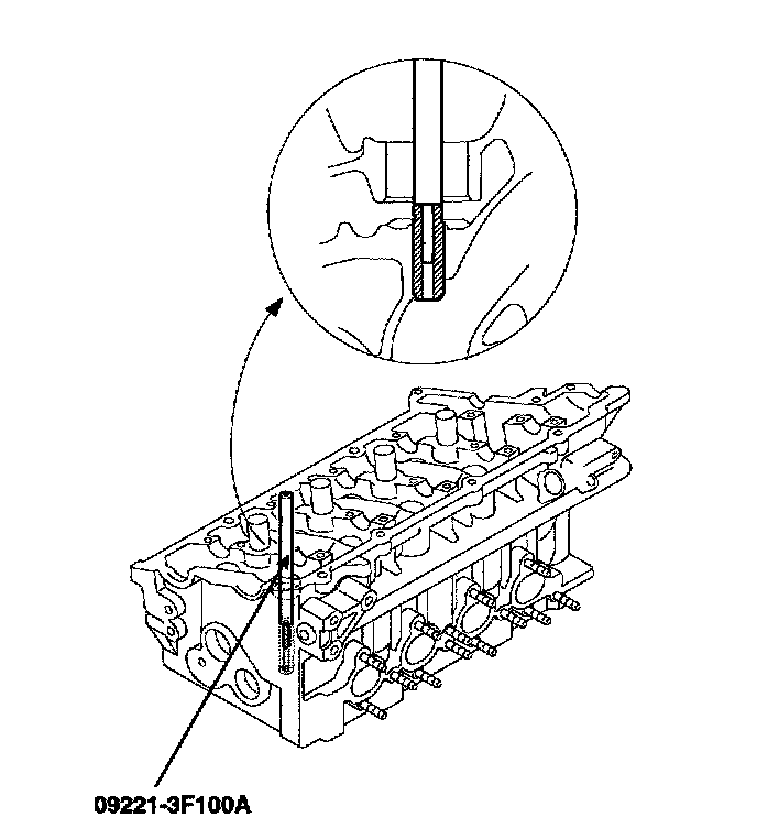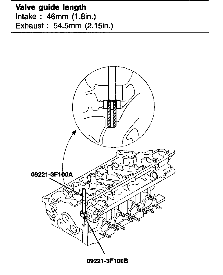 3. Using the SST (09221-3F100 A/B), press-fit the valve guide. The valve guide must be press-fitted from the upper side of the cylinder head. Keep in mind that the intake and exhaust valve guides are different in length.