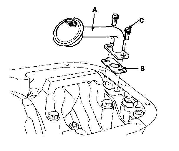 Install a new gasket (B) and oil screen (A) with 2 bolts (C).