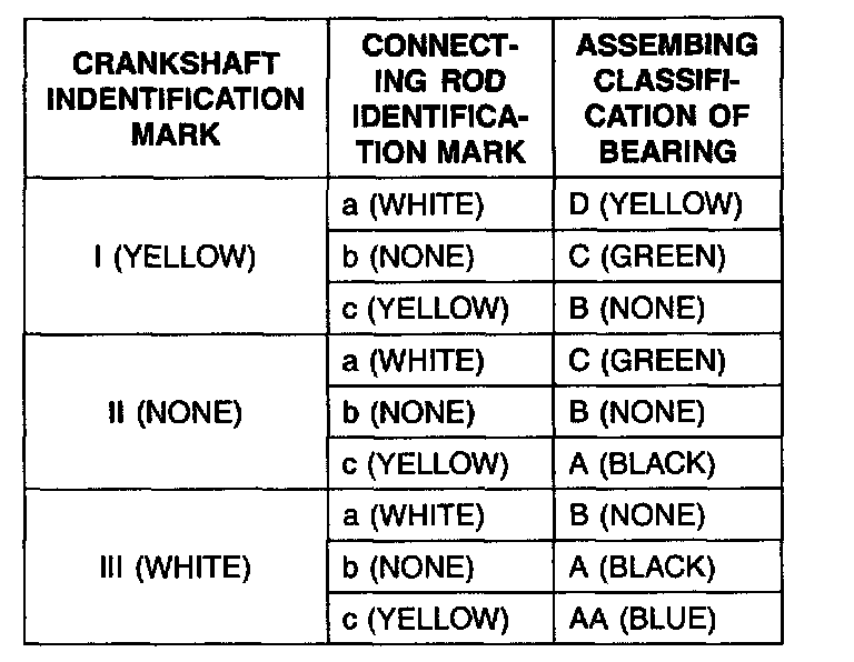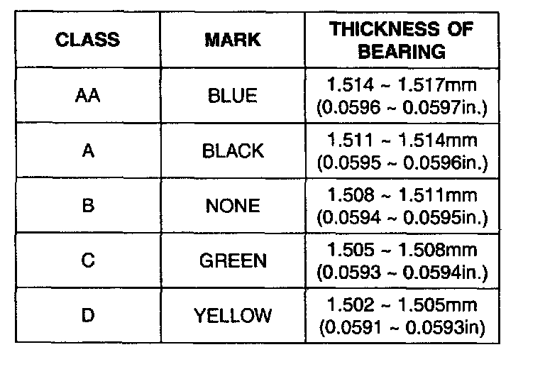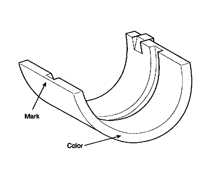 6. If the plastigage measures too wide or too narrow, remove the upper half of the bearing, install a new, complete bearing with the same color mark (select the color as shown in the next column), and recheck the clearance.