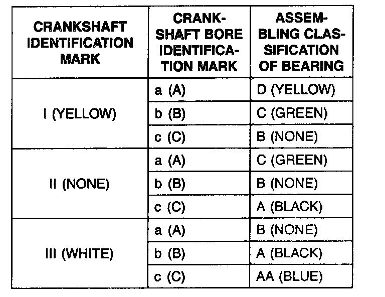 9. If the plastigage measures too wide or too narrow, remove the upper half of the bearing, install a new, complete bearing with the same color mark (select the color as shown in the next column), and recheck the clearance.