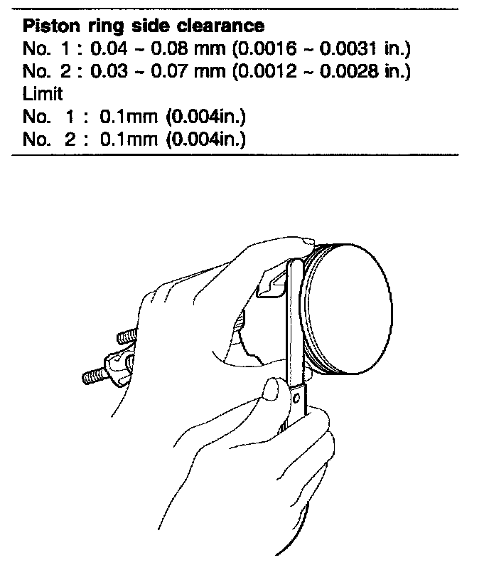 4. Inspect the piston ring side clearance. Using a feeler gauge, measure the clearance between new piston ring and the wall of the ring groove.