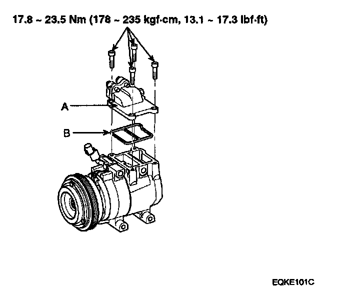 7. Using a hexagon wrench (6 mm) remove the bolts, the manifold assembly (A) and the gasket (B) from the compressor.