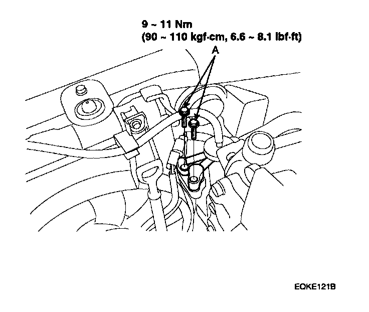 4. Remove the bolts (A), then disconnect the discharge line and condenser line from the condenser. Plug or cap the lines immediately after disconnecting them to avoid moisture and dust contamination.