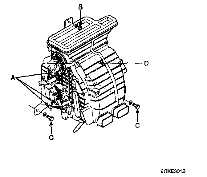 7. Disconnect the connectors (A) from the temp. actuator, the mode actuator and the thermistor, then remove the mounting nut (B), the mounting bolts (C) and heater & evaporator unit (D).