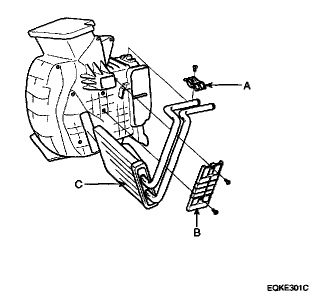 Be careful not to bend the inlet and outlet pipes during heater core(C) removal, and pull out the heater core.