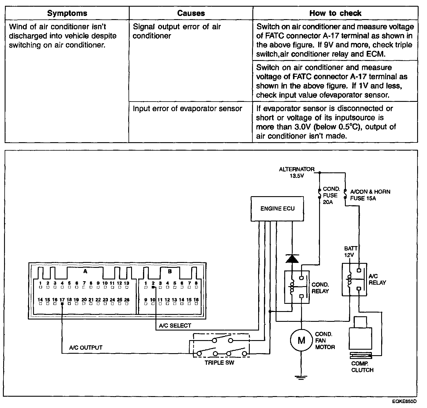 11 V is outputted from connector A-17 terminal in turning on INSULATING and pressing air conditioner switch. However, although 11 V is outputted from FATC connector A-17 terminal, compressor clutch isn't driven. Wind of air conditioner is discharged if only compressor clutch works. Output signal from air conditioner is inputted in engine computer through triple switch. Then, the engine computer considers several conditions and when output of air conditioners judged to be practical, it gives GND to signal terminal of air conditioner relay. Accordingly, relay of air conditioner is ON and compressor clutch works. Triple switch checks pressure of refrigerant flowing through pipe and turns on/off switches in it according to standard. So, it controls that output signal of air conditioner outputted from FATC is inputted into engine computer, and also speed of condenser fan according to pressure level. (For high pressure, high-speed and for low pressure, low-speed.