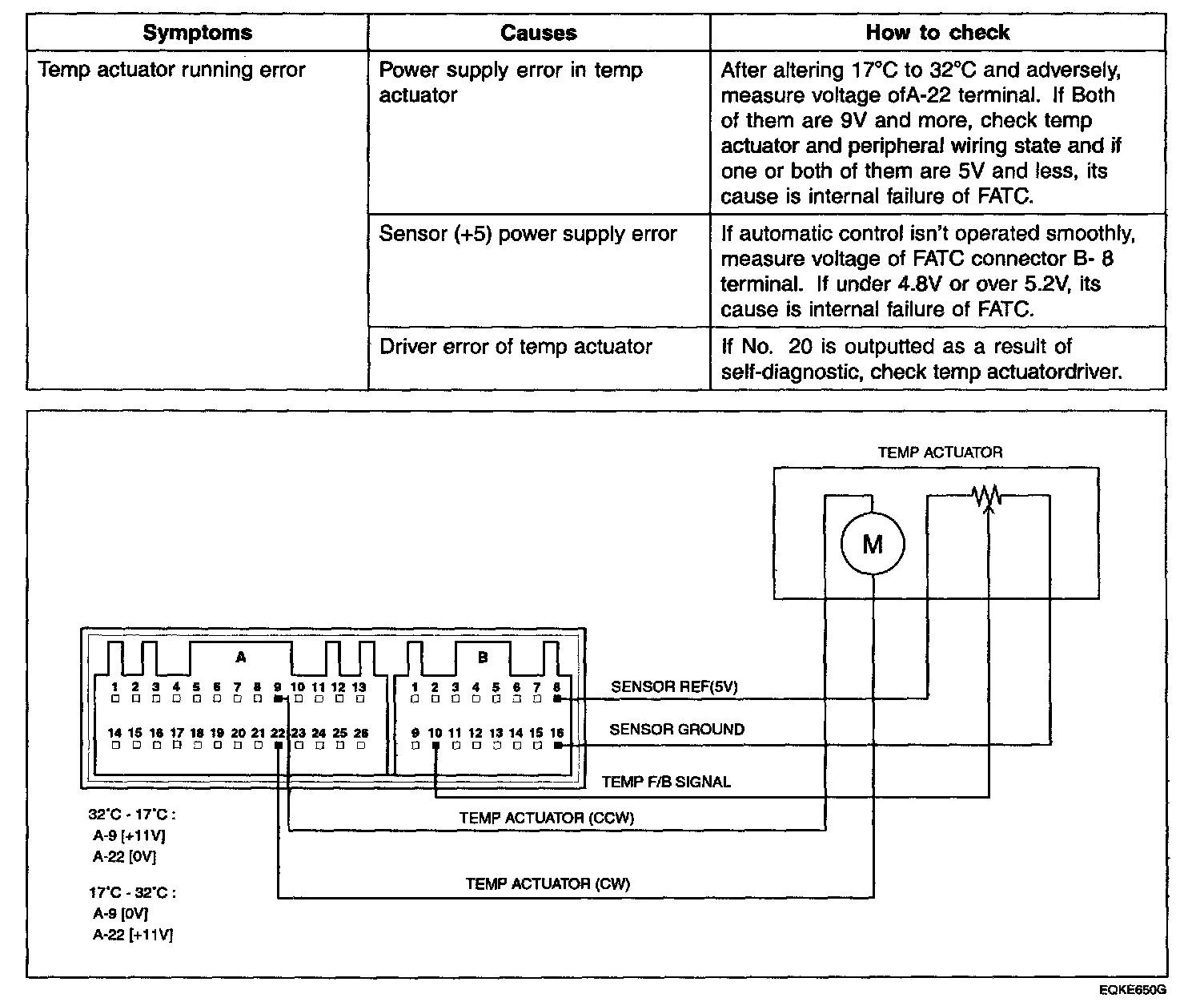 In adjusting temp switch from 32 °C to 17 °C, 11 V is outputted from FATC connector A-9 terminal, 0 V is supplied for A-22 terminal and temp motor works in direction of COOL. In adjusting temp switch from 17 °C to 32 °C, 11 V is outputted from FATC connector A-22 terminal, 0 V is supplied for A-9 terminal and temp motor works in direction of WARM. When temp actuator has to move to a certain location for its automatic control, temp feedback signal terminal moves equally in temp actuator and informs controller of location of temp actuator through FATC connector B-10 terminal. Comparing original value with inputted value, it works until they are same. If 4.9 V and more is inputted in B-10 terminal, it is regarded as disconnection. If 0.1 V and less is inputted in B-10 terminal, it is regarded as short-circuit. In the case of disconnection or short-circuit as a result of self-diagnostic, substitute control is carried out as follows.