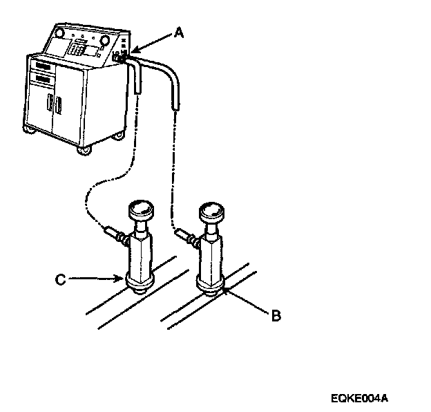 1. Connect a R-134a refrigerant recovery recycling/charging station(A) to the high-pressure service port(B) and the low-pressure service port(C), as shown, following the equipment manufacturers instruction.