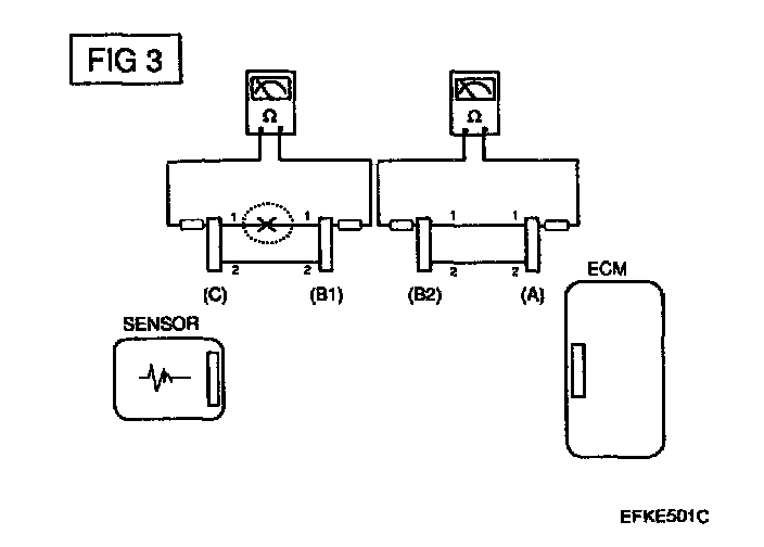 b. Disconnect connector (B), and measure for resistance between connector (C) and (B1) and between (B2 and (A) as shown in [FIG. 3].