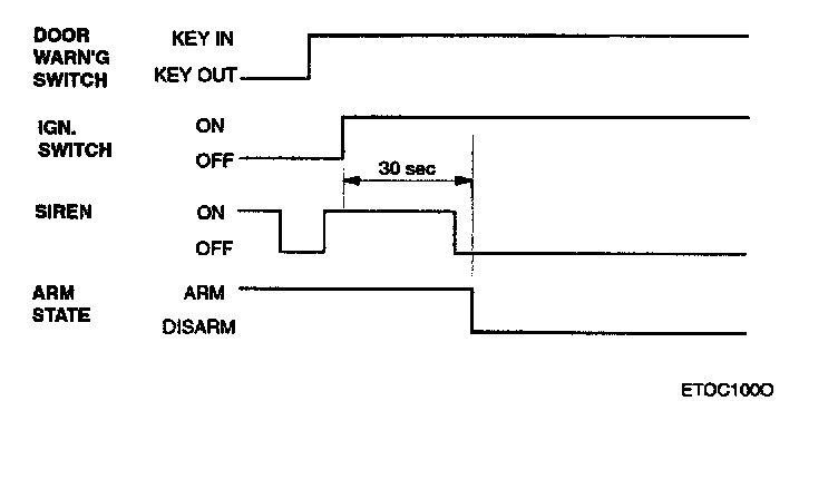 After the alarm state or start inhibit state are entered, if door warning switch on (key in ignition) & IGN 2 ON, if IGN 2 state is changed to OFF within 30 sec, remain in alarm state.