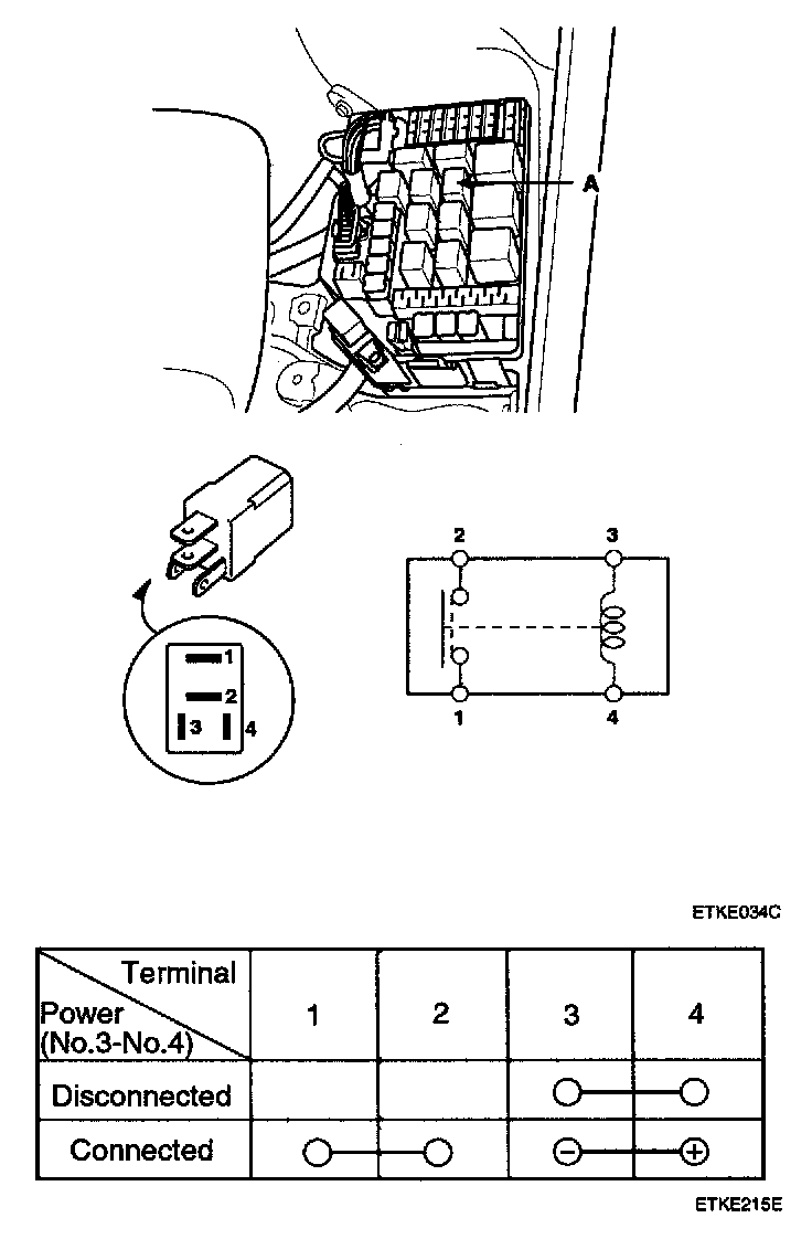 3. There should be continuity between the No.1 and No.2 terminals when power and ground are connected to the No.4 and No.3 terminals.
