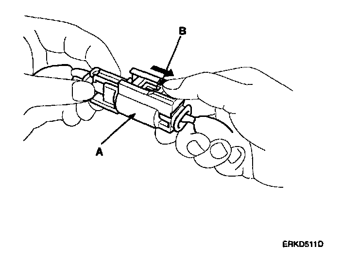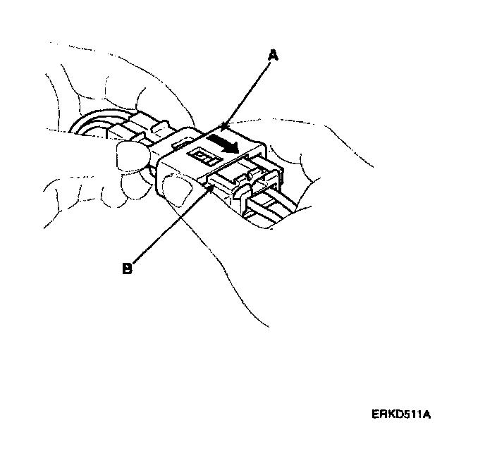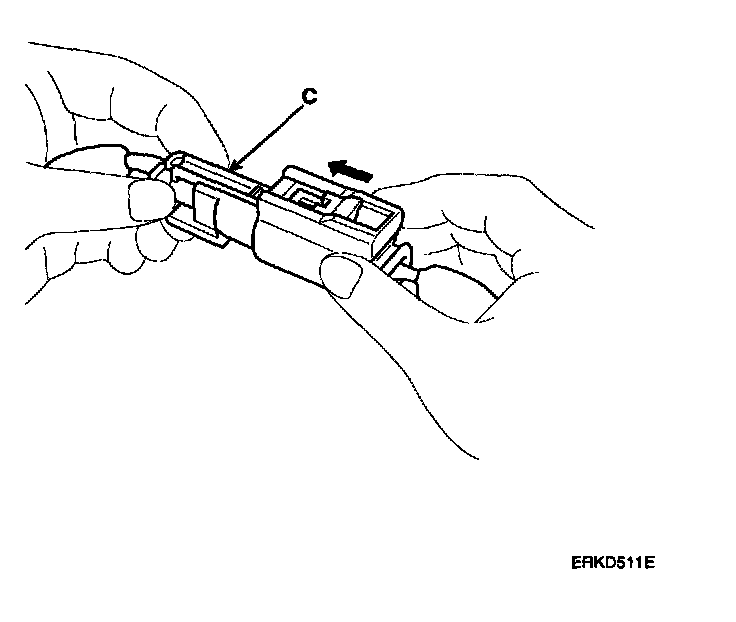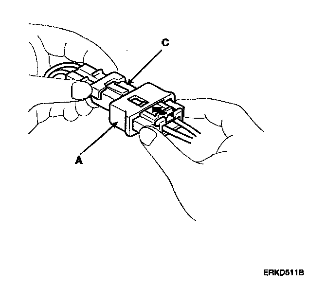1. To reconnect, hold the pawl-side connector half, and press on the back of the sleeve-side connector half in the direction shown. As the two connector halves are pressed together, the sleeve (A) is pushed back by the pawl (C). Do not touch the sleeve.
