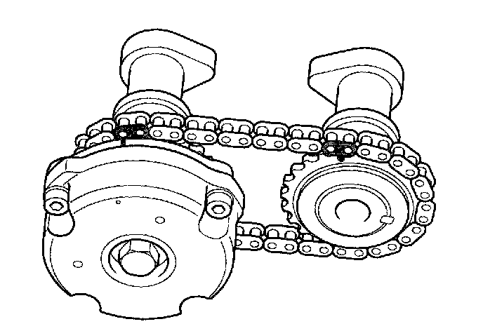 Align the camshaft timing chain with the intake timing chain sprocket and exhaust timing chain sprocket as shown.