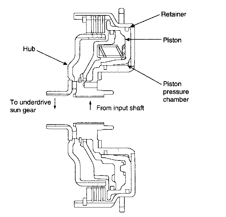 Hydraulic pressure acts in the piston pressure chamber (between the piston and retainer) and thus pushes the piston. In turn, the piston depresses the clutch discs and thereby transmits driving force from the retainer to the hub side.