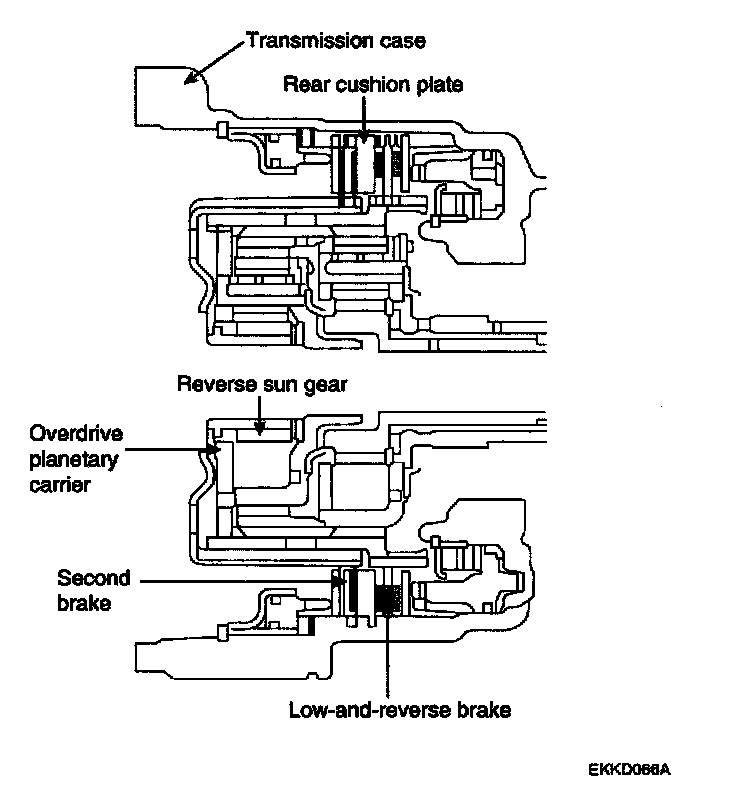 The low-reverse brake operates in 1st and reverse gears, when the vehicle is parked, and during manual operation. It locks the low-reverse annulus gear and overdrive planetary carrier to the case.