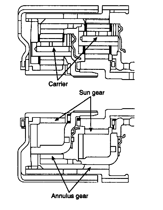 This arrangement allows the gear ratio to be varied by connecting or locking the carriers and sun gears.