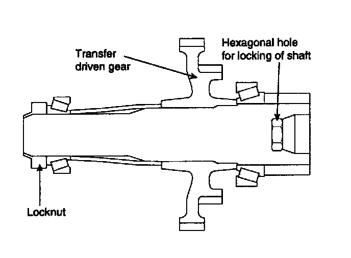 As shown in the illustration, the transfer driven gear is press-fitted onto the output shaft, and the output shaft is secured by a locknut and supported by bearings.