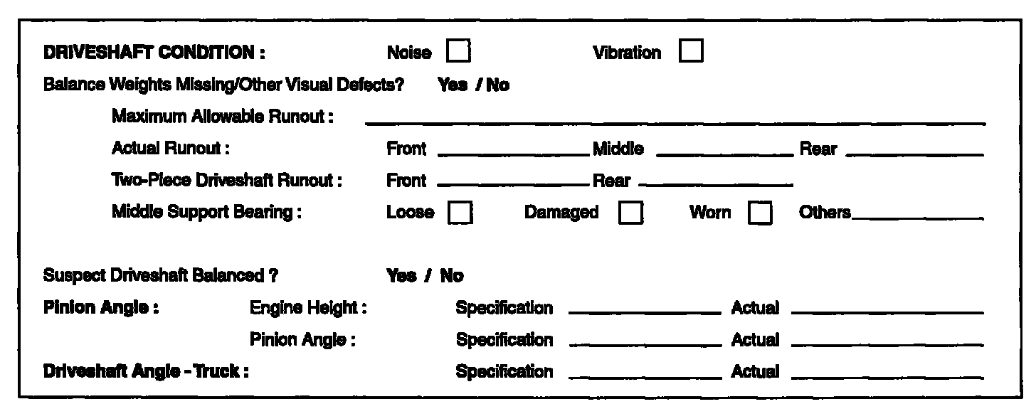 To assist the service adviser and the technician, check the driveshaft condition with the questions listed by filling them.